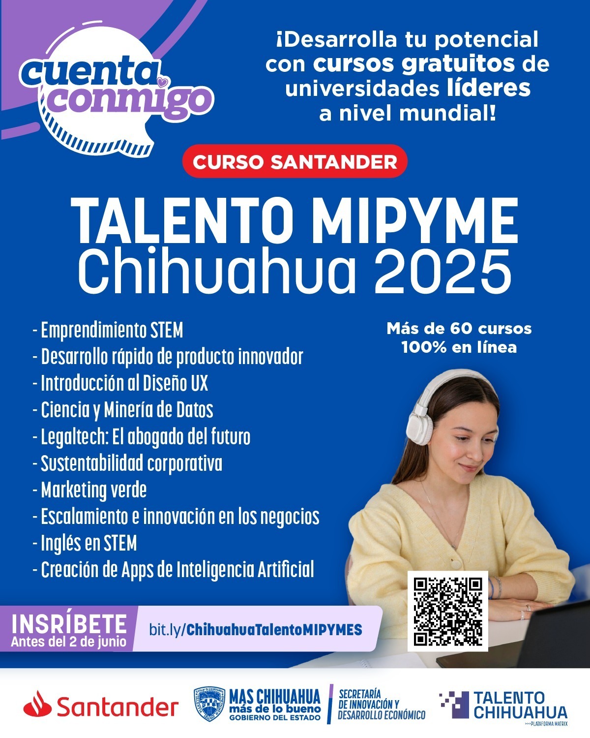 Tras la colaboración entre el Banco Santander y la Secretaría de Innovación y Desarrollo Económico (SIDE) para fortalecer a emprendedores chihuahuenses, se extiende la invitación a micro, pequeñas y medianas empresas (mipymes) a participar en el programa Talento Mipyme Chihuahua 2025, que ofrece acceso a más de 60 cursos en línea a través de la plataforma Coursera.